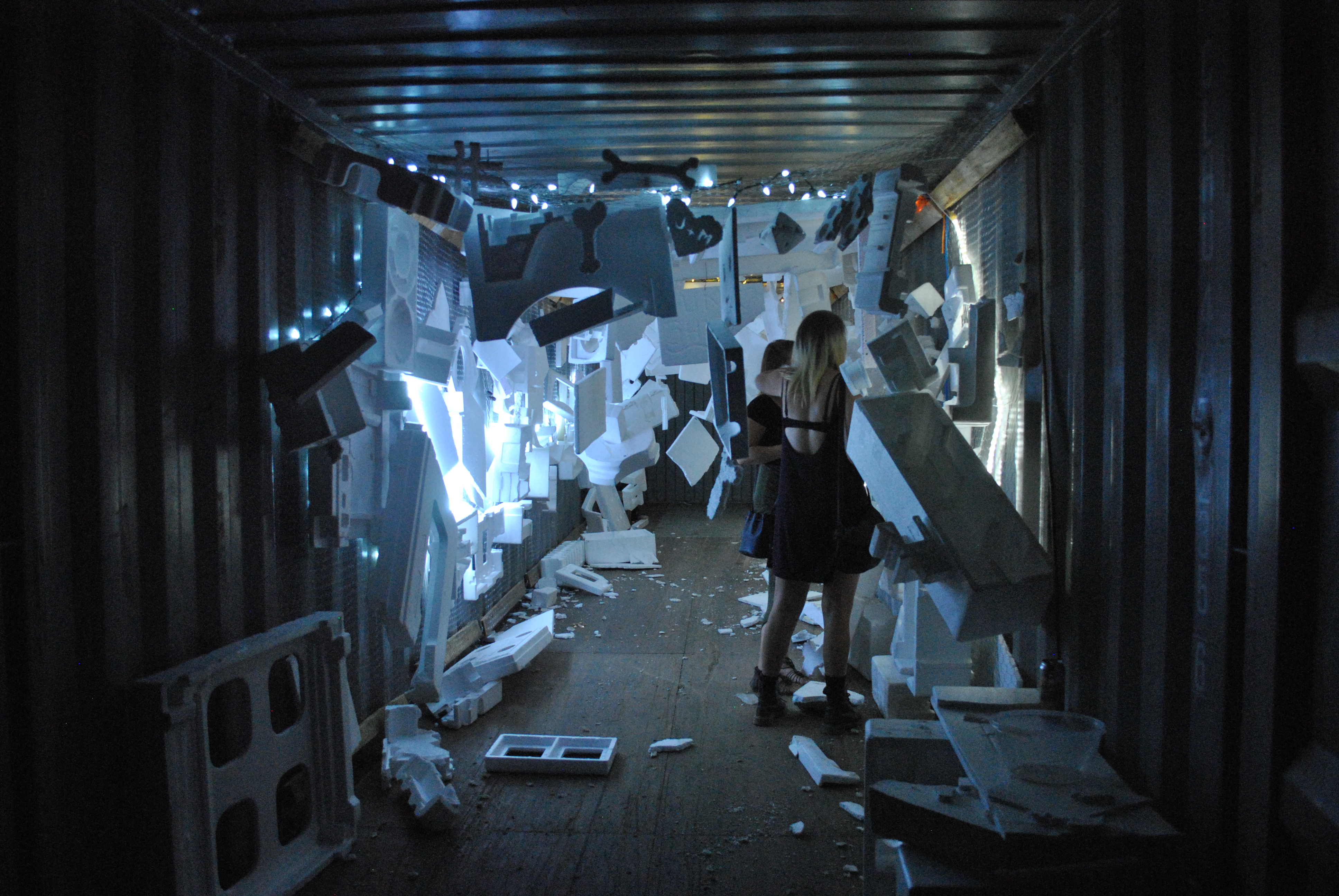 This installation for Steel Rails 16 invites participants to build a styrofoam room inside a shipping container at a former industrial site in Kitchener, Ontario. Taking from a huge pile of styrofoam collected mainly from Kitchener curbs over a number of weeks, contributors install their pieces (as-is, carved, or otherwise altered) on an illuminated armature on the walls and ceiling. Musician Ben Grossman turns styrofoam and other objects found on the site into speakers and musical instruments, creating an industrial soundscape within the container. After the event, 45 kg of styrofoam was taken to be recycled at the Erb Street landfill in Waterloo.