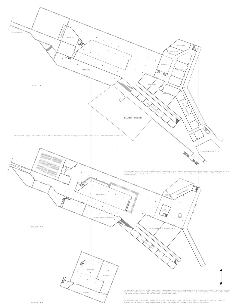 This project is for an underground museum located next to Roma Termini and Piazza dei Cinquecento to house the Torlonia Collection. The site is reorganized to provide a sloping public piazza and separate bus stop area. The museum accommodates other public programs such as a bar/café, restaurant, and retail on the first level below ground, along with gallery/studios and workshops for the museum. This level also has connections to the numismatic collections of the Museo Nazionale in the basement of the Palazzo Massimo, as well as the Repubblica and Termini metro stations.