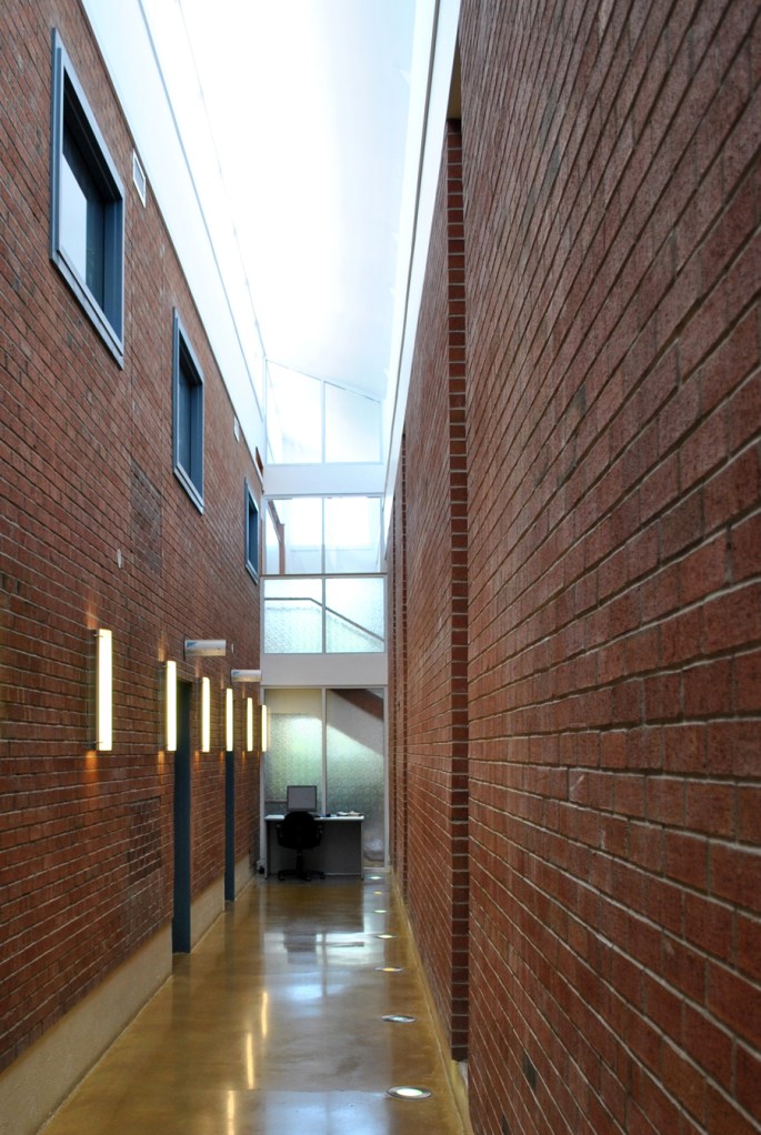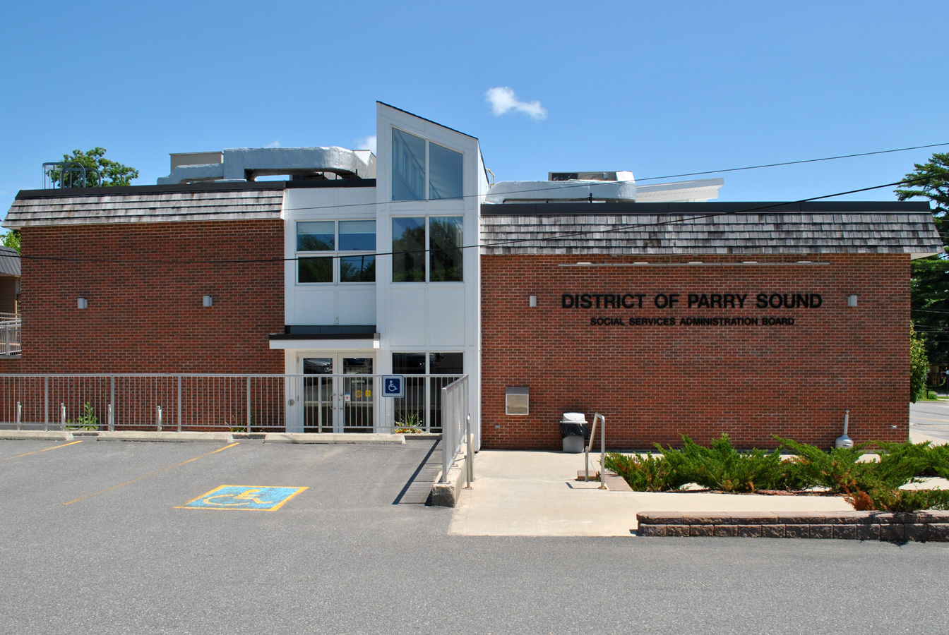 The District of Parry Sound Social Services Administration Board integration project involved renovating, connecting, and adding to two existing brick buildings to provide consolidated office space for the social services provider. A series of clerestory windows brings natural light into the narrow space between the two original structures, while the angled roof above collects energy through photovoltaic panels.